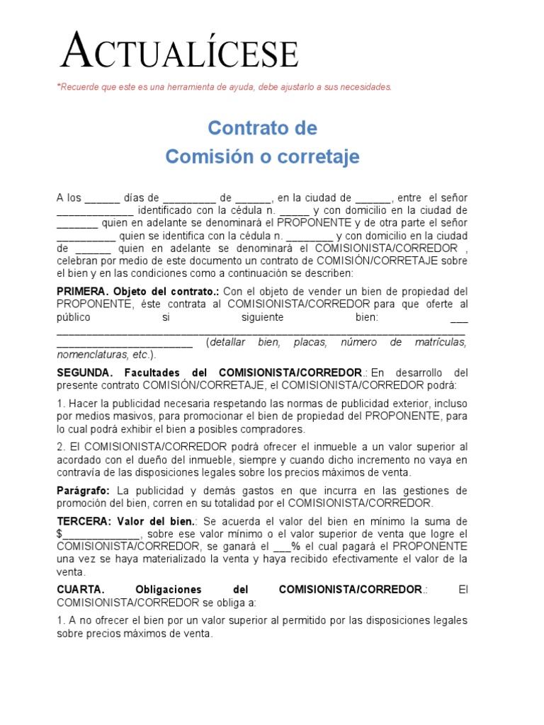 celebran por medio de este documento un contrato de COMISIÓN/CORRETAJE sobre