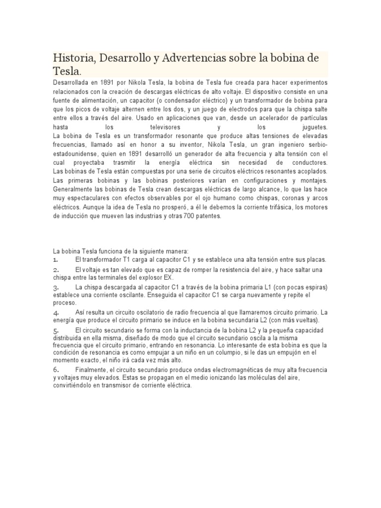 En el siguiente trabajo se observara todo lo relacionado sobre La Bobina Tesla desde suinvención