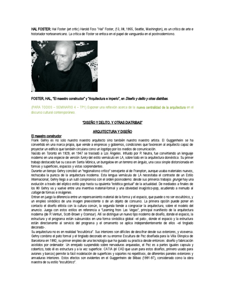 historiador norteamericano. La crítica de Foster se enfoca en el papel de vanguardia en el postmodernismo.