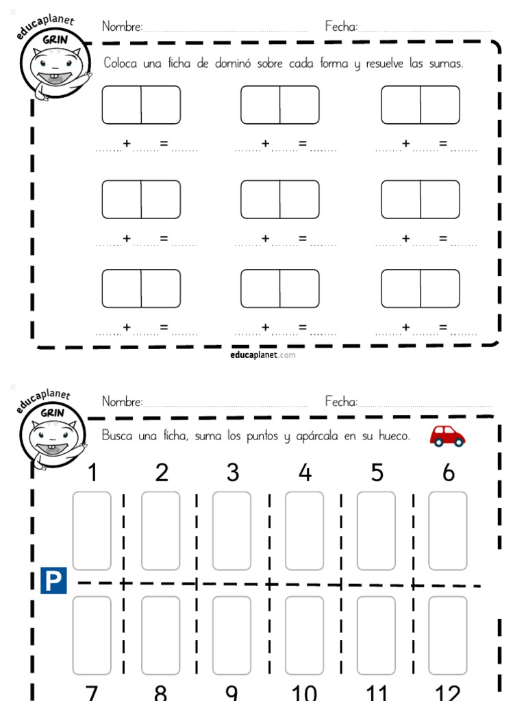 Coloca una ficha de dominó sobre cada forma y resuelve las sumas.