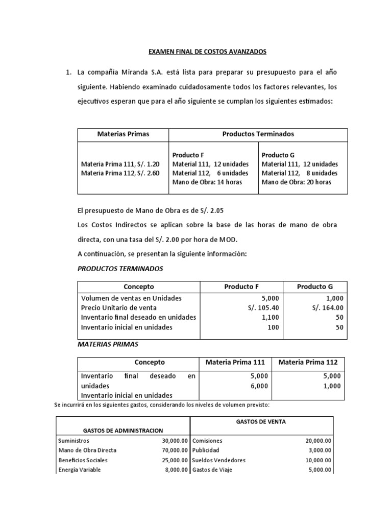 1. La compañía Miranda S.A. está lista para preparar su presupuesto para el año