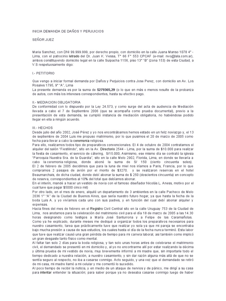 Que vengo a iniciar formal demanda por Daños y Perjuicios contra Jose Perez, con domicilio en Av. Los