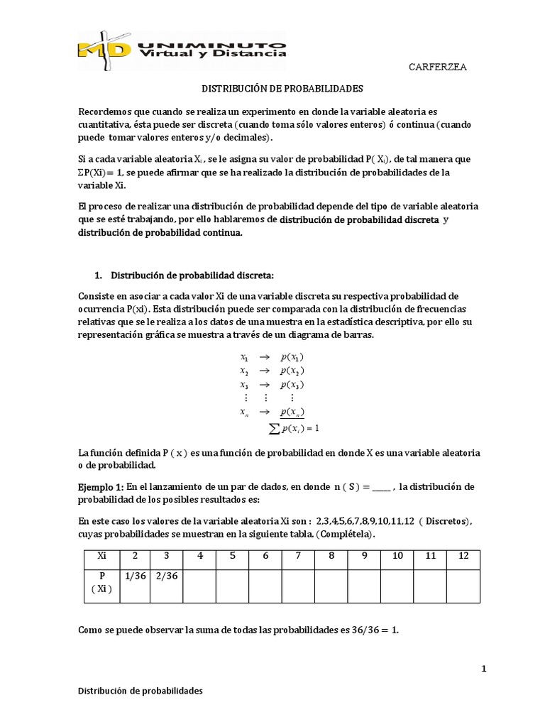 que se esté trabajando, por ello hablaremos de distribución de probabilidad discreta y