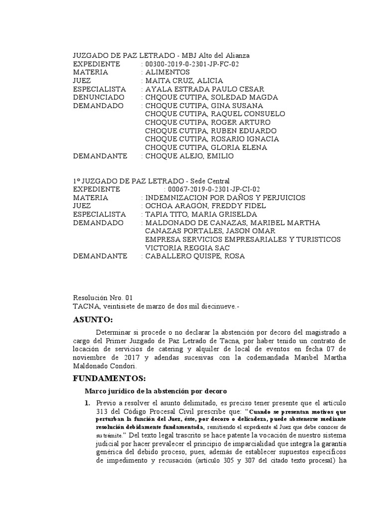 magistrado a cargo del Primer Juzgado de Paz Letrado de Tacna ha tenido una