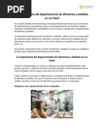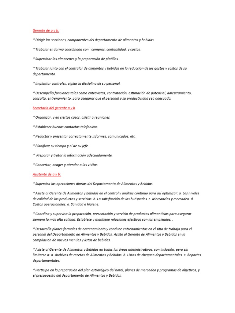 personal del Departamento de Alimentos y Bebidas. Asiste al Gerente de Alimentos y Bebidas en la