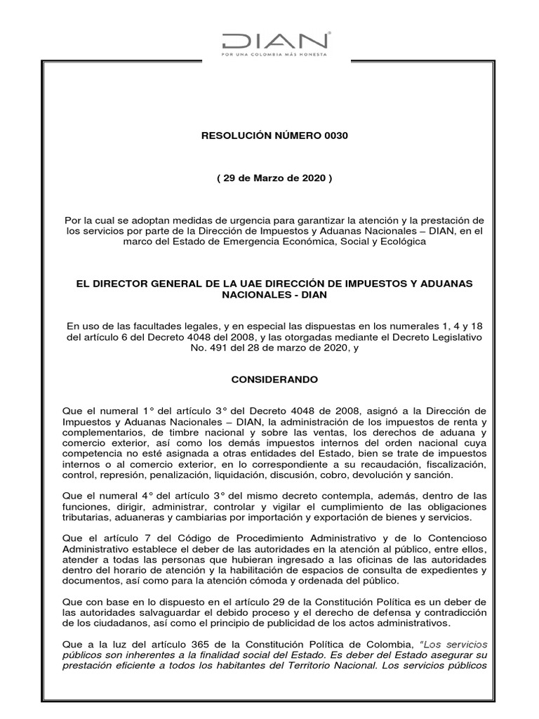 Que la Dirección de Impuestos y Aduanas Nacionales – DIAN profirió la Resolución 0030