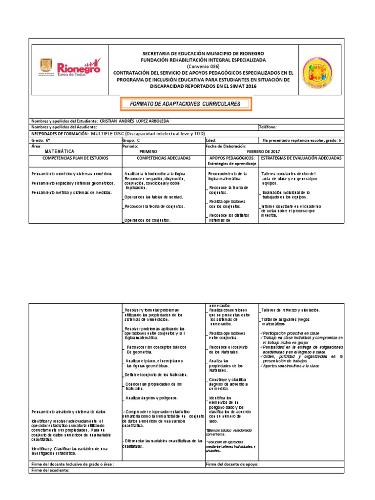 Firma del docente Inclusivo de grado o área : Firma del docente de apoyo: