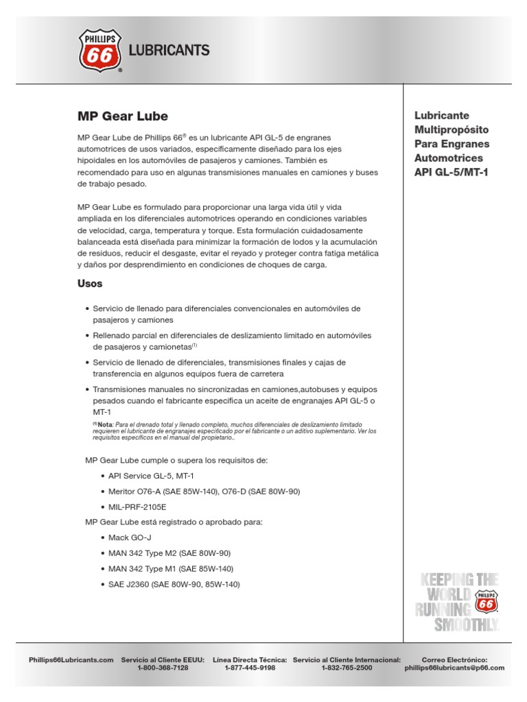 MP Gear Lube de Phillips 66® es un lubricante API GL-5 de engranes
