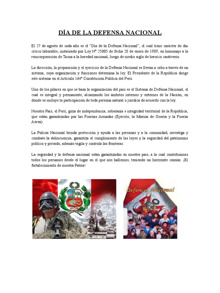 El 27 de agosto de cada año es el “Día de la Defensa Nacional”, el cual tiene carácter de día