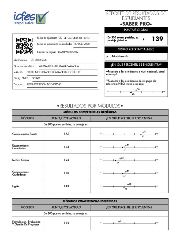 resultado no incluye los módulos de El puntaje se reporta en una escala de 0 a