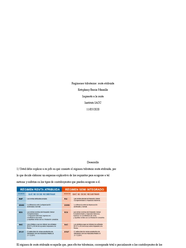 1) Usted debe explicar a su jefe en qué consiste el régimen tributario renta atribuida, por