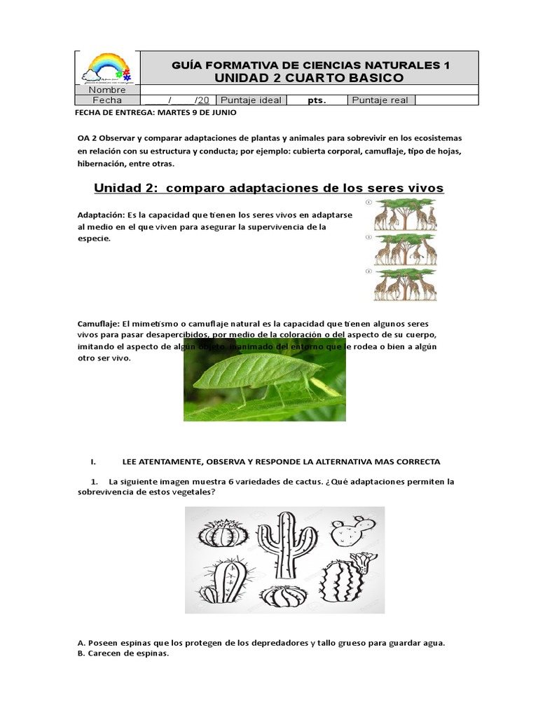 Guia Formativa Ciencias Naturales Unidad 2 Adaptac Iones de Los Seres Vivos 4to