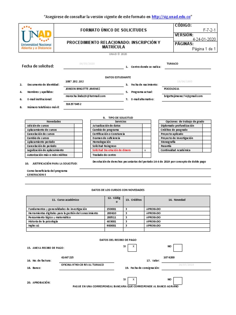 Legalización de aplazamiento Solicitud Devolución de dinero x Continuidad Académica