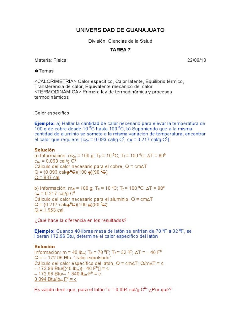 Ejemplo: a) Hallar la cantidad de calor necesario para elevar la temperatura de