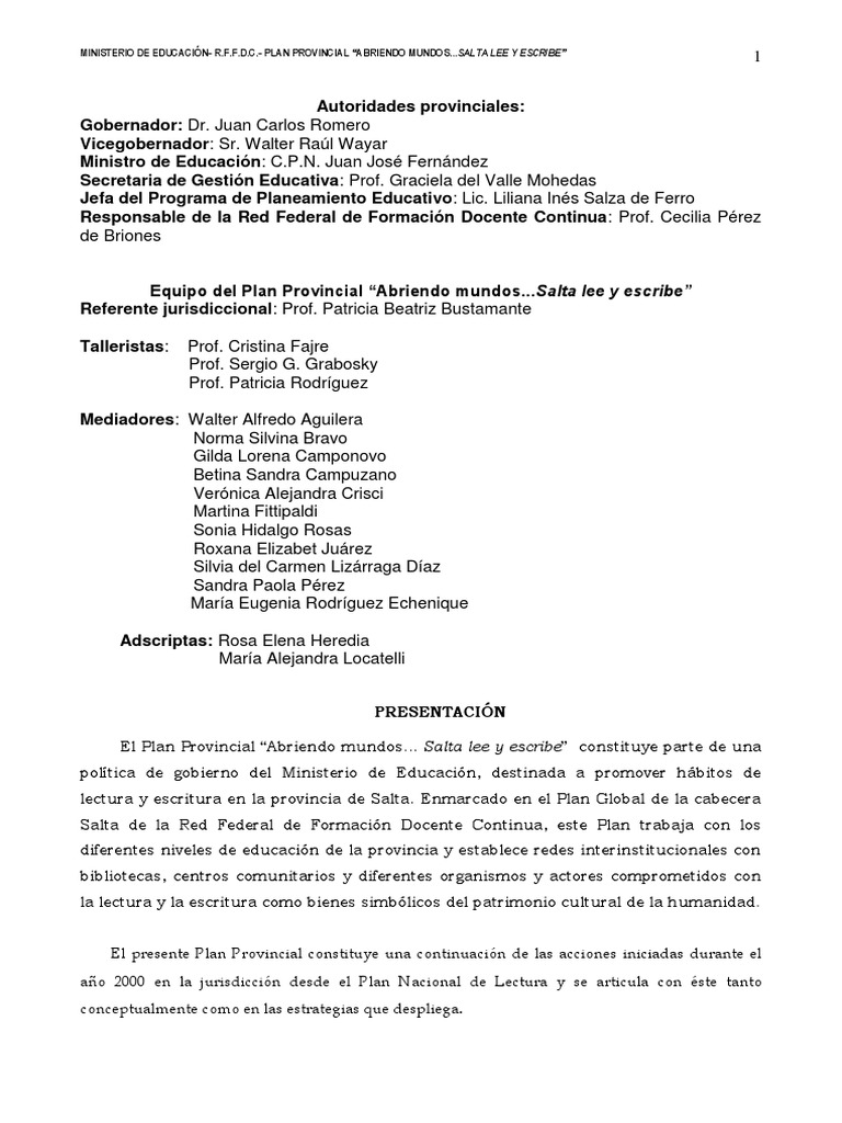 MINISTERIO DE EDUCACIÓN- R.F.F.D.C.- PLAN PROVINCIAL “ABRIENDO MUNDOS...SALTA LEE Y ESCRIBE” 2