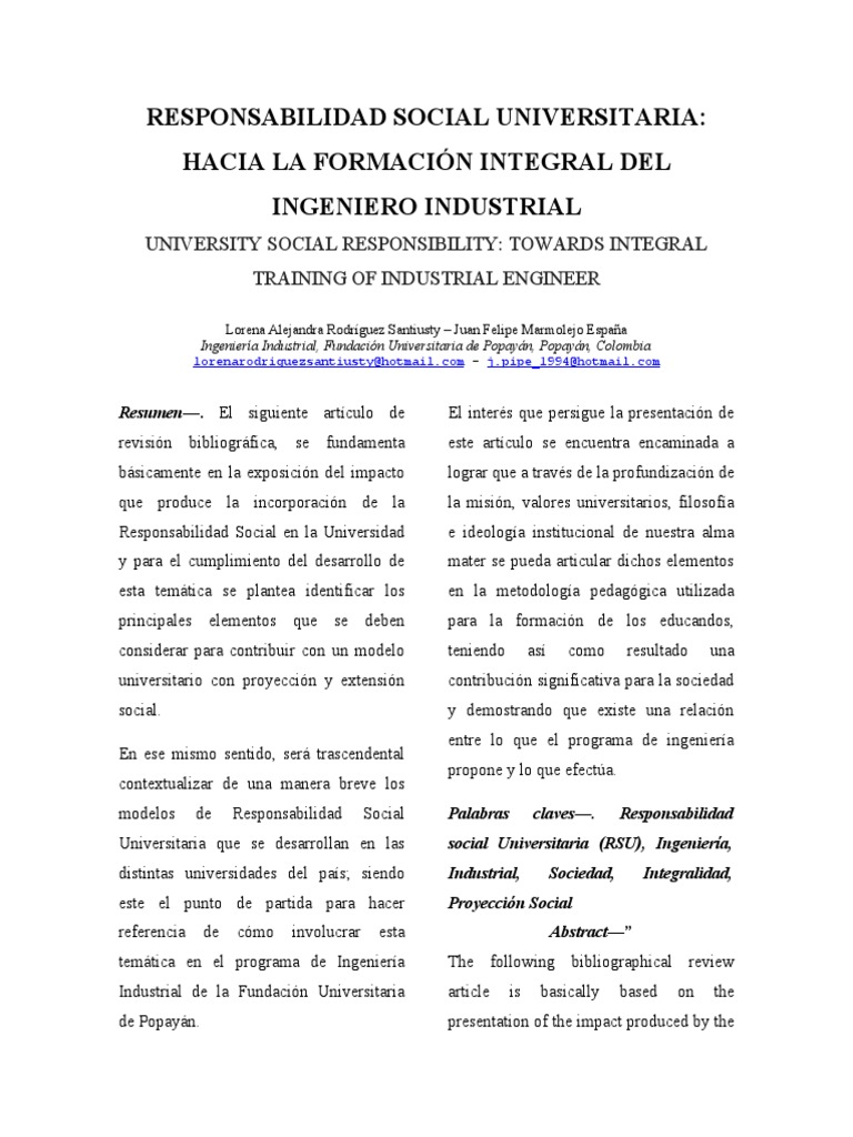 Universitaria que se desarrollan en las social Universitaria (RSU), Ingeniería,