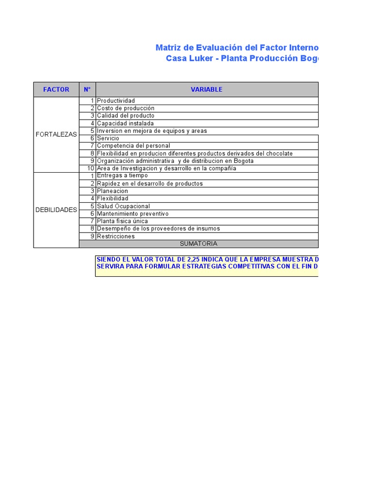 SIENDO EL VALOR TOTAL DE 2,25 INDICA QUE LA EMPRESA MUESTRA DEBILIDAD INTERNA. E