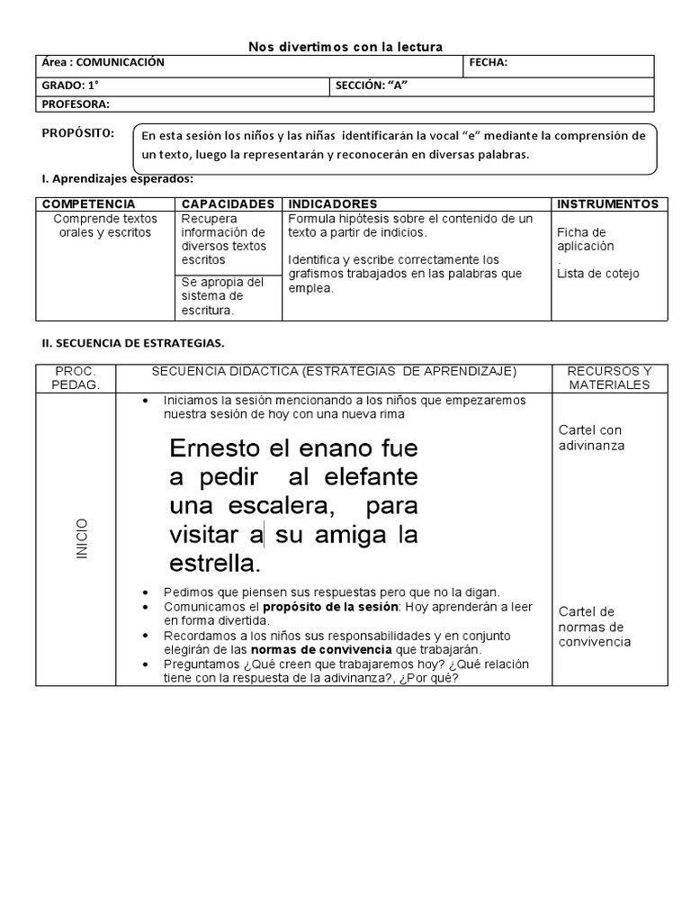 PROPÓSITO: En esta sesión los niños y las niñas identificarán la vocal “e” mediante la comprensión de