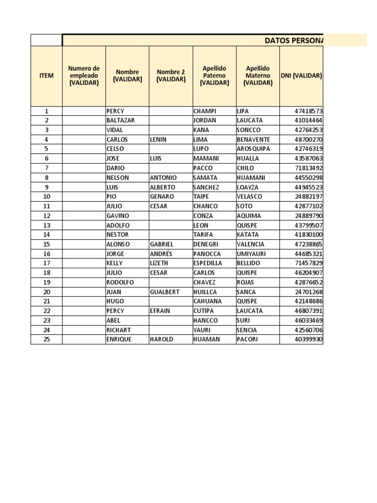 ITEM empleado Nombre Nombre 2 Paterno Materno DNI (VALIDAR)