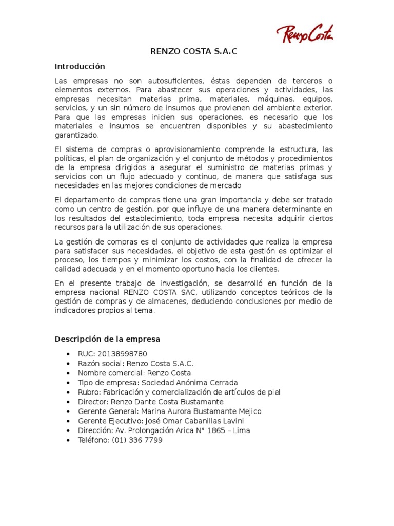 empresa nacional RENZO COSTA SAC, utilizando conceptos teóricos de la
