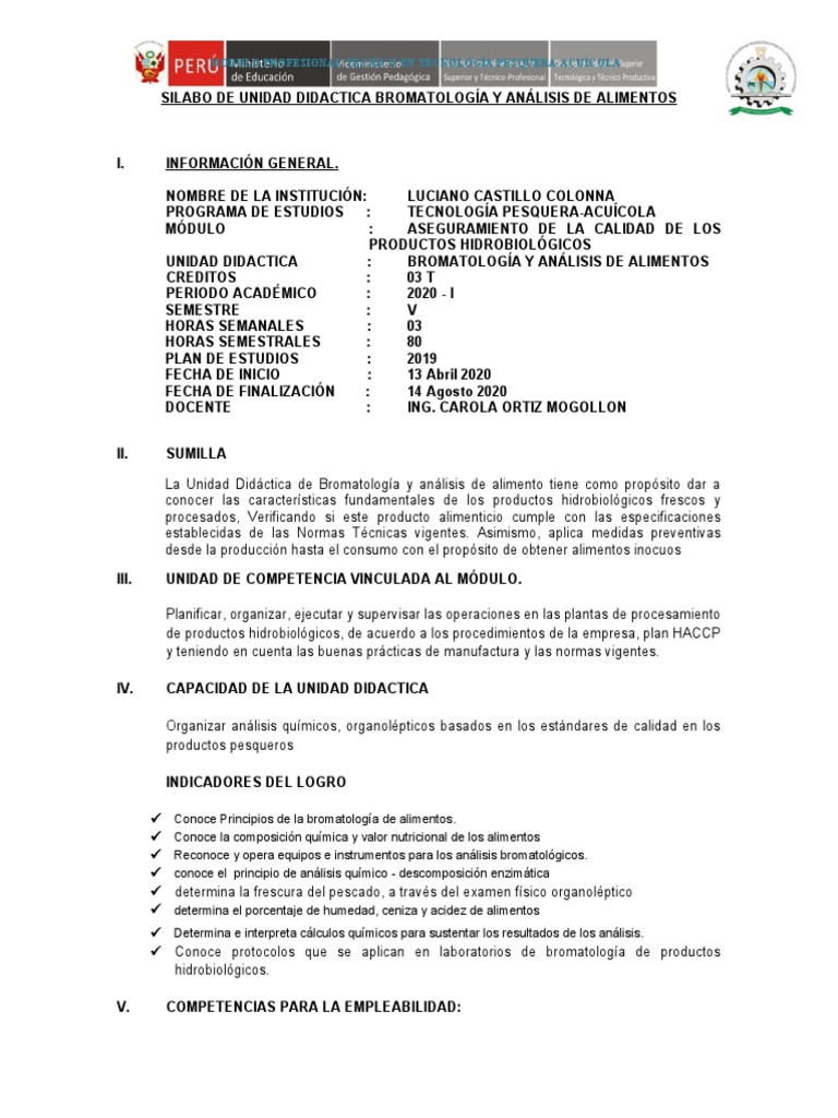SILABO DE UNIDAD DIDACTICA BROMATOLOGÍA Y ANÁLISIS DE ALIMENTOS