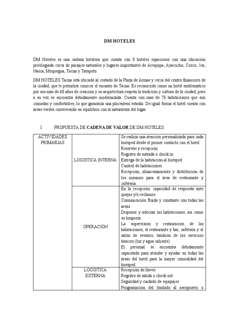 I. PROPUESTA DE CADENA DE VALOR DE DM HOTELES