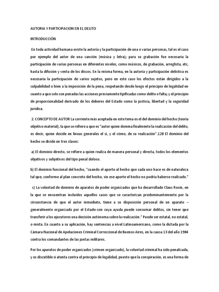 participación. De la teoría del dominio del hecho surgen las formas de autoría como la directa o