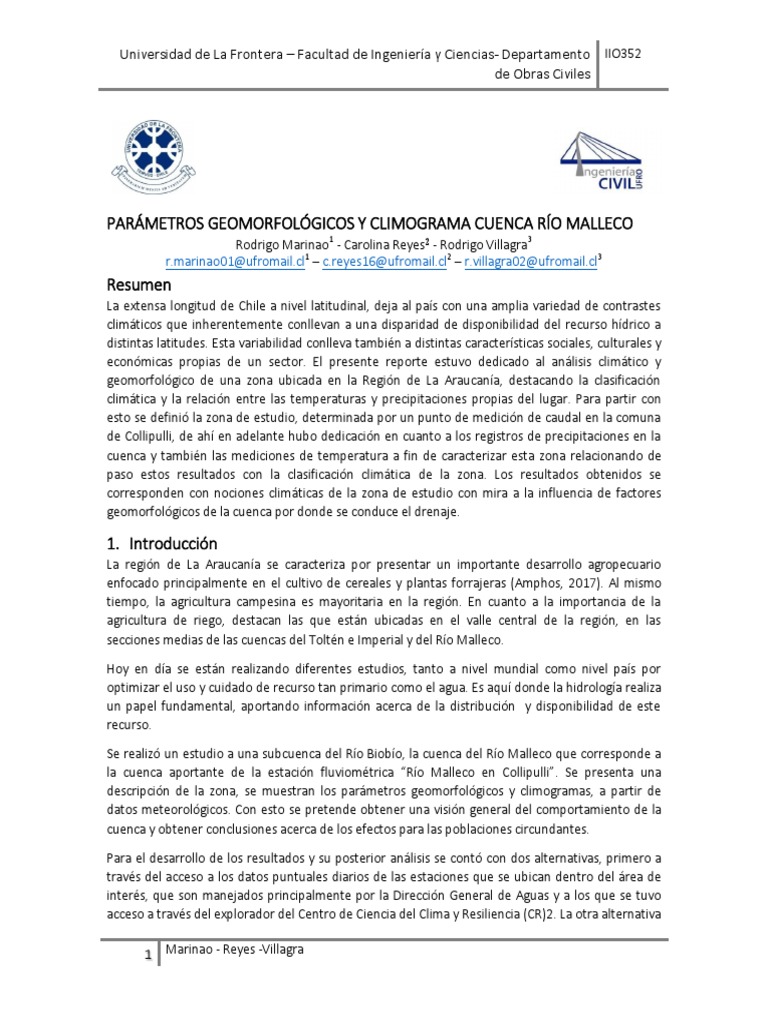 PARÁMETROS GEOMORFOLÓGICOS Y CLIMOGRAMA CUENCA RÍO MALLECO