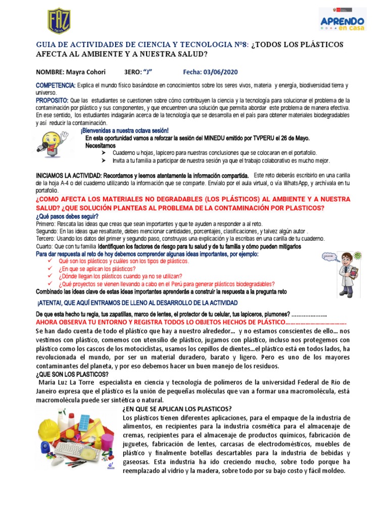 GUIA DE ACTIVIDADES DE CIENCIA Y TECNOLOGIA N°8: ¿TODOS LOS PLÁSTICOS