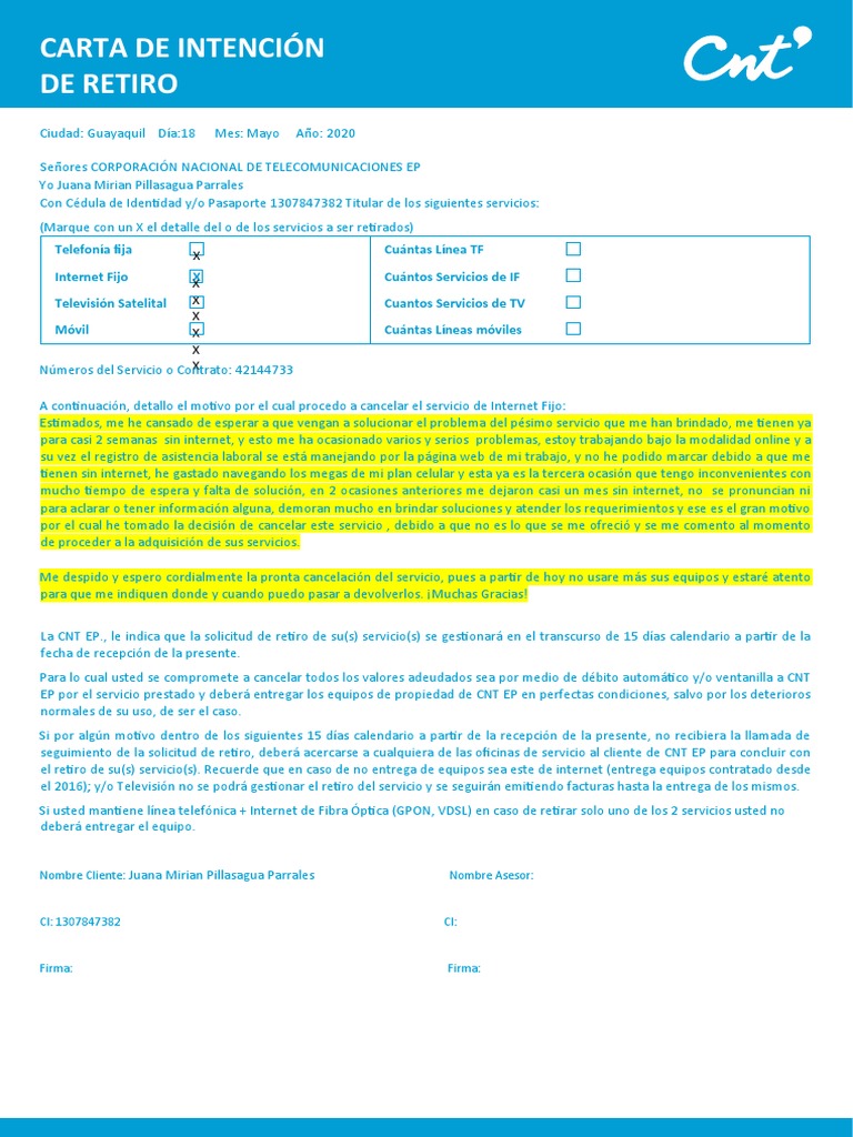 La CNT EP., le indica que la solicitud de retiro de su(s) servicio(s) se gestionará en el transcurso de 15 días calendario a partir de la