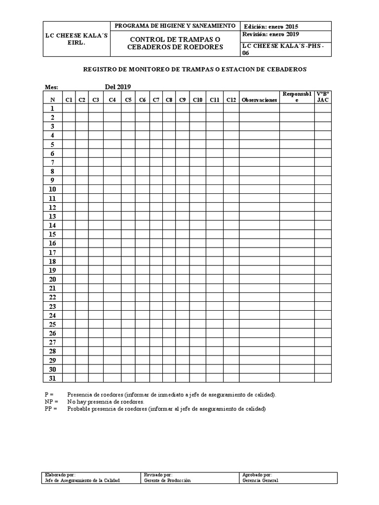P= Presencia de roedores (informar de inmediato a jefe de aseguramiento de calidad).