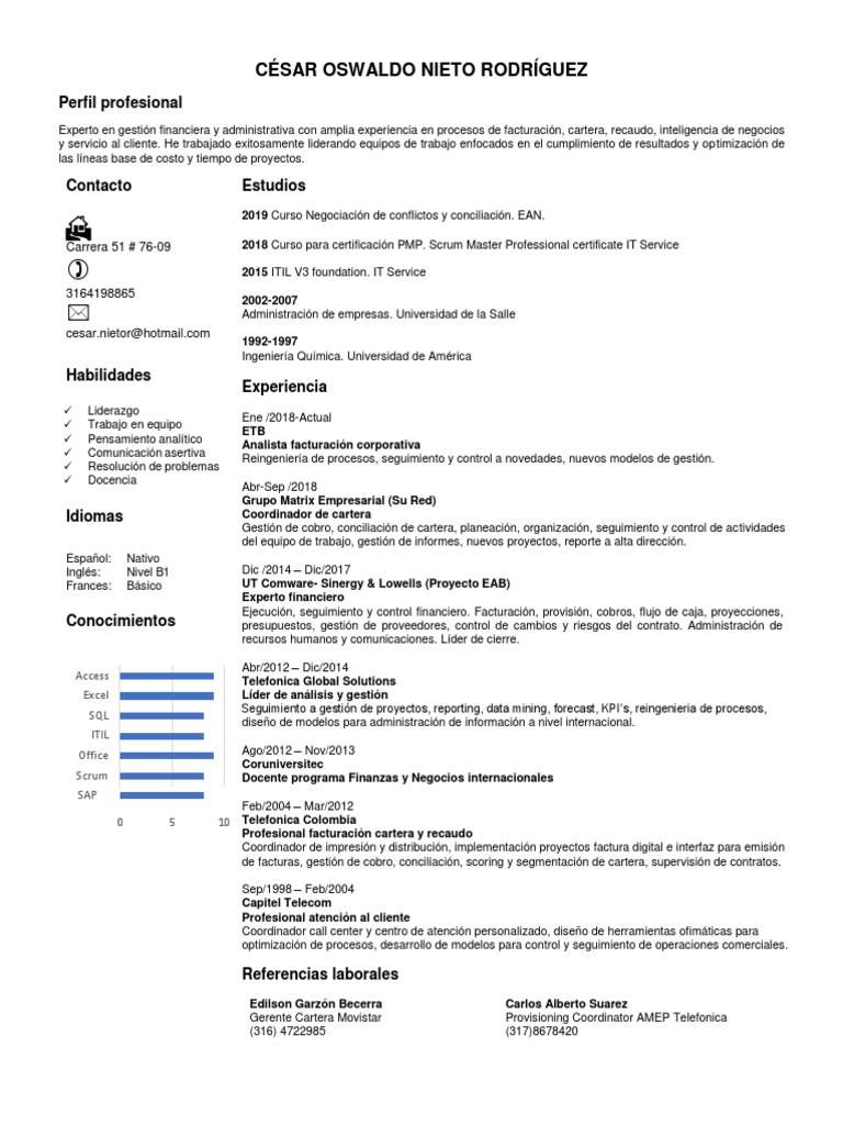 y servicio al cliente. He trabajado exitosamente liderando equipos de trabajo enfocados en el cumplimiento de resultados y optimización de