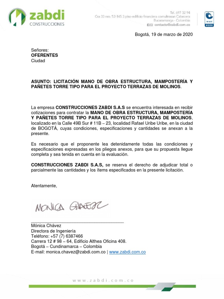 CONSTRUCCIONES ZABDI S.A.S., se reserva el derecho de adjudicar total o