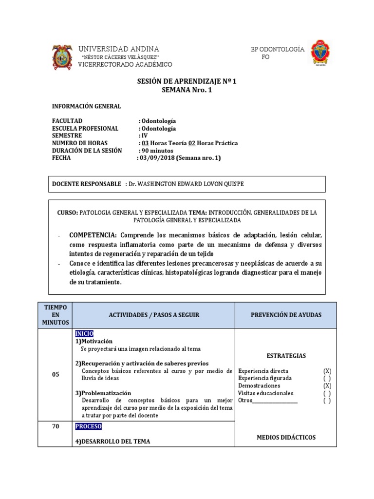 generalidades de la patología general y especializada Material didá ctico escrito (X)