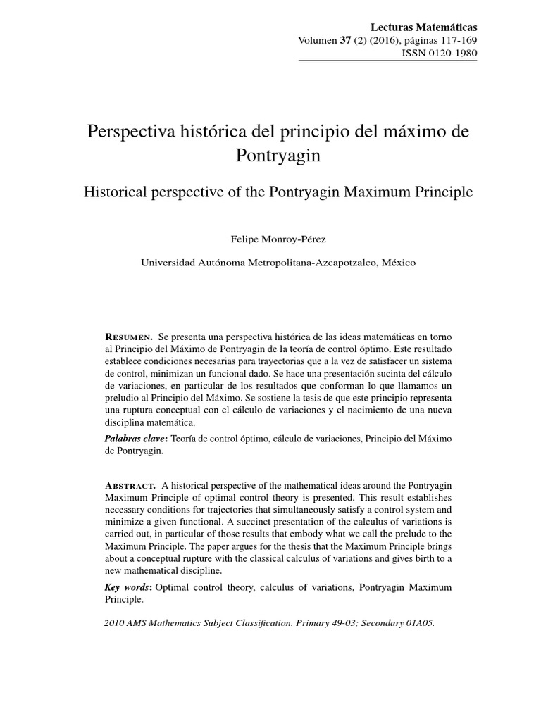 168 Felipe Monroy-Pérez Perspectiva histórica del principio del máximo de Pontryagin