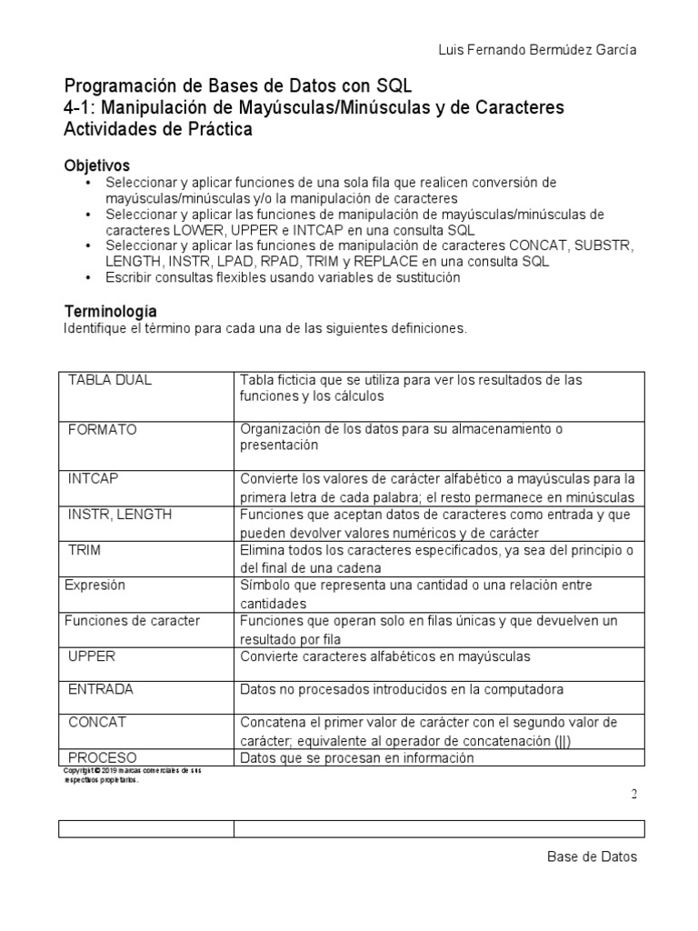 • Seleccionar y aplicar las funciones de manipulación de caracteres CONCAT, SUBSTR,