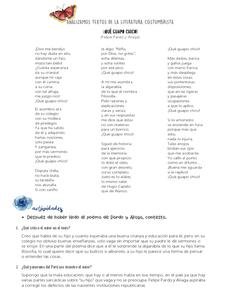 • Después de haber leído el poema de Pardo y Aliaga, contesta.