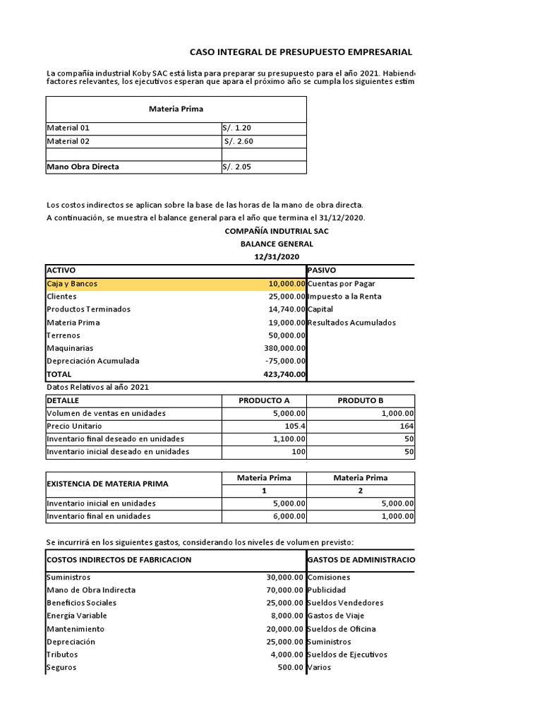 La compañía industrial Koby SAC está lista para preparar su presupuesto para el año 2021. Habiendo examinado cuidadosamente todo