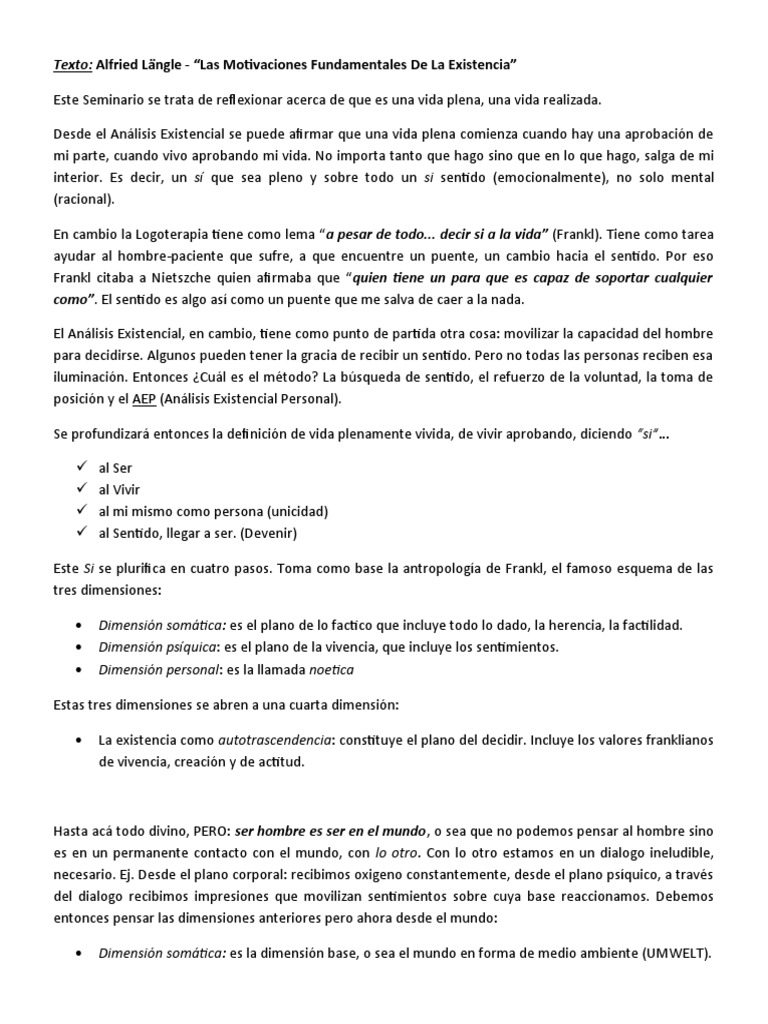 y sentido (D.Trasc). Cada uno constituye una guía para trabajar en el Análisis Existencial.
