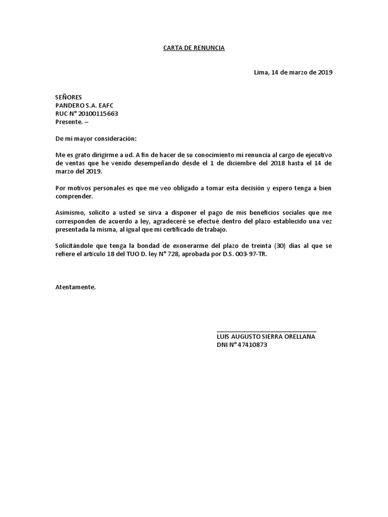 Me es grato dirigirme a ud. A fin de hacer de su conocimiento mi renuncia al cargo de ejecutivo