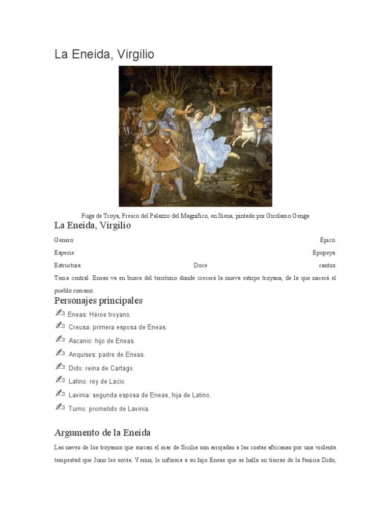 Tema central: Eneas va en busca del territorio donde crecerá la nueva estirpe troyana, de la que nacerá el