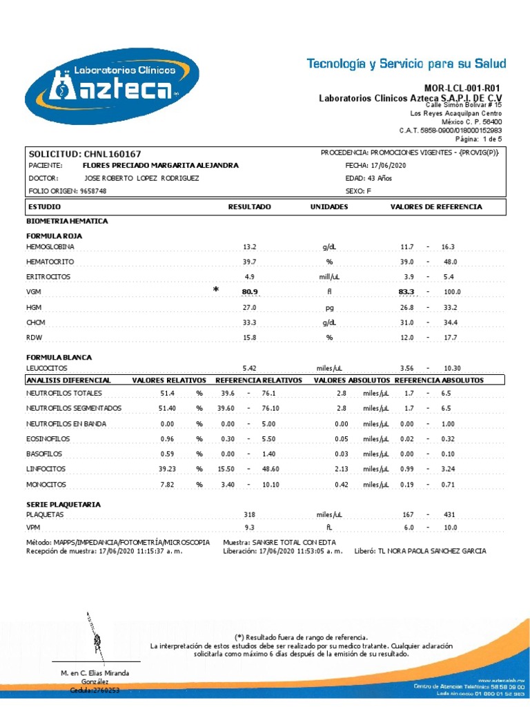 PACIENTE: FLORES PRECIADO MARGARITA ALEJANDRA FECHA: 17/06/2020