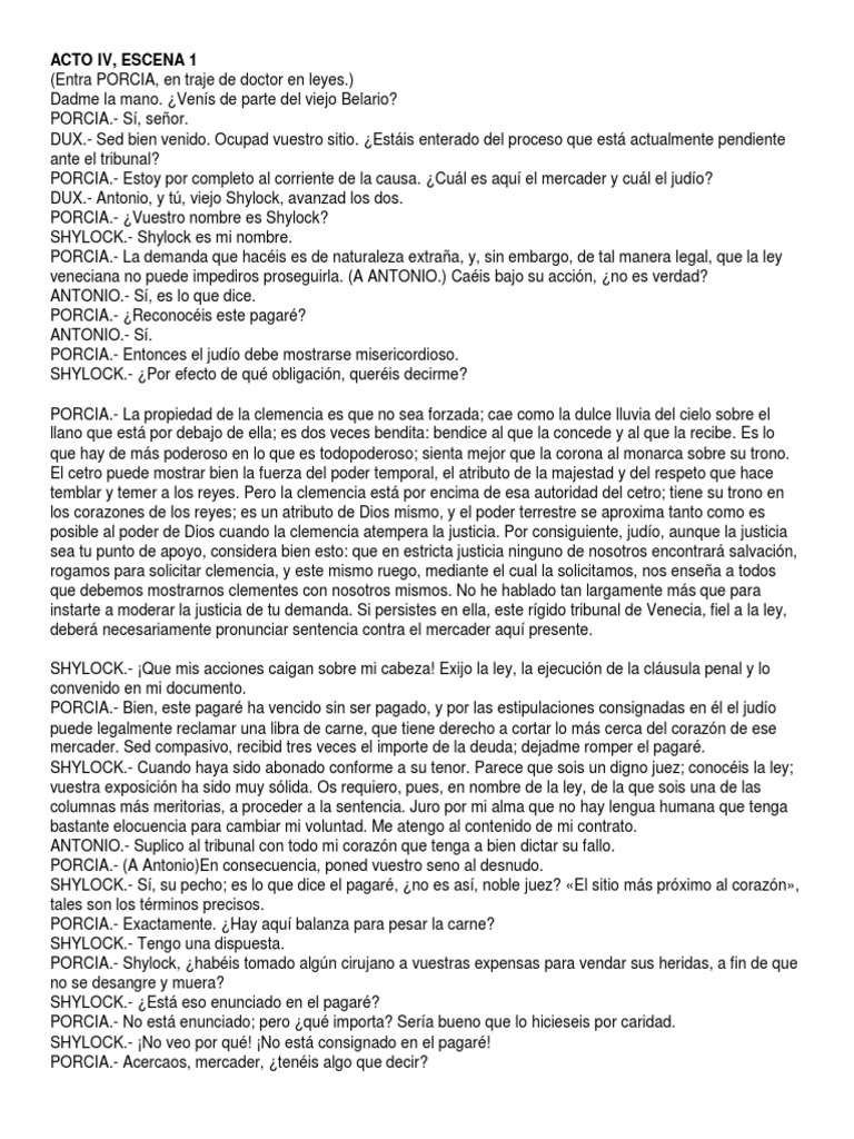 PORCIA.- Verás tú mismo el texto; pues, ya que pides justicia, ten por seguro que la obtendrás, más de lo que