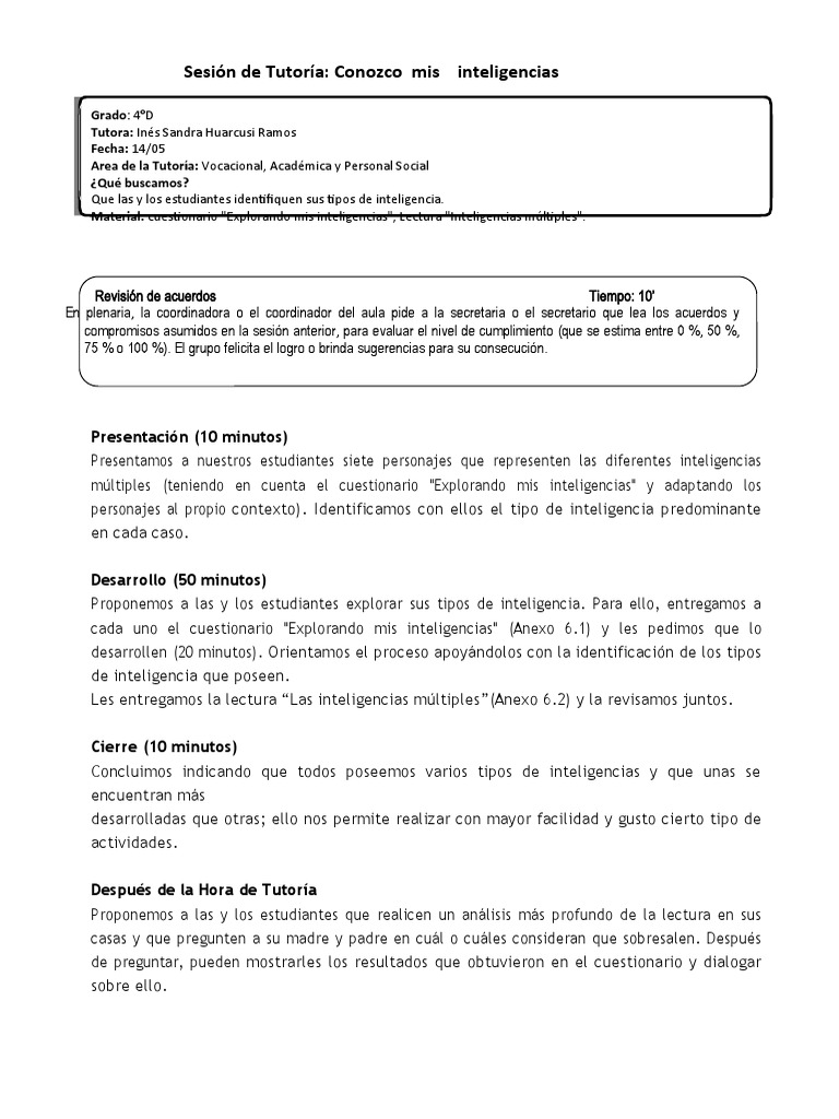 Sesión de Tutoría: Conozco mis inteligencias