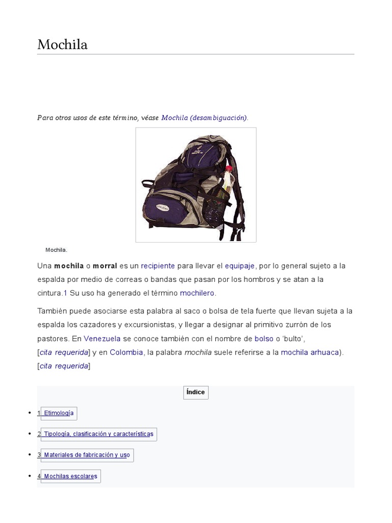 Una mochila o morral es un recipiente para llevar el equipaje, por lo general sujeto a la
