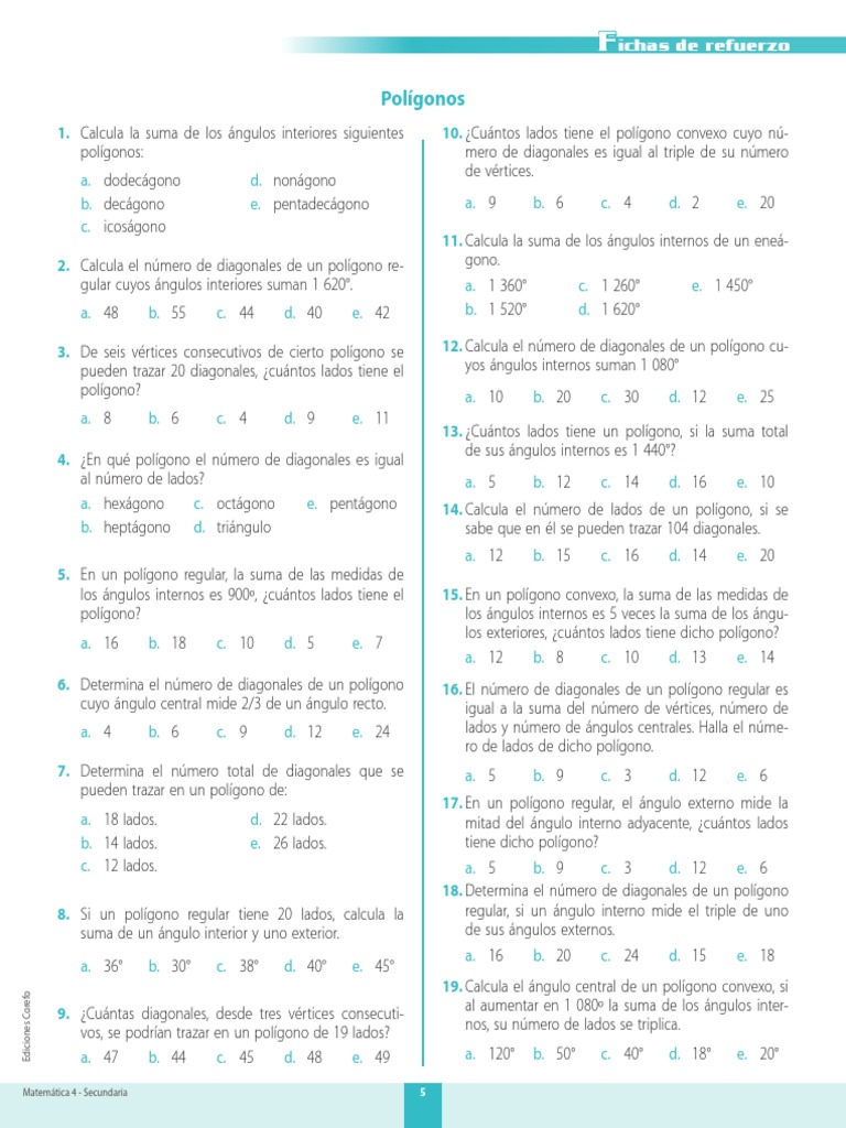 1. Calcula la suma de los ángulos interiores siguientes 10. ¿Cuántos lados tiene el polígono convexo cuyo nú-