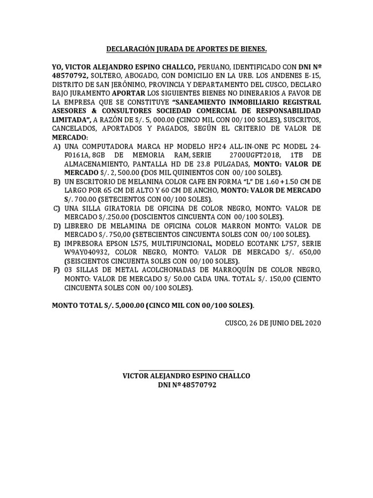 DECLARACIÓN JURADA DE APORTES DE BIENES.