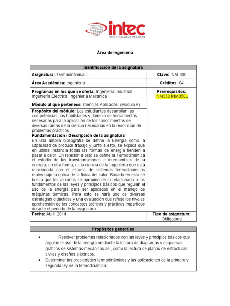 Asignatura: Termodinámica I Clave: INM-300