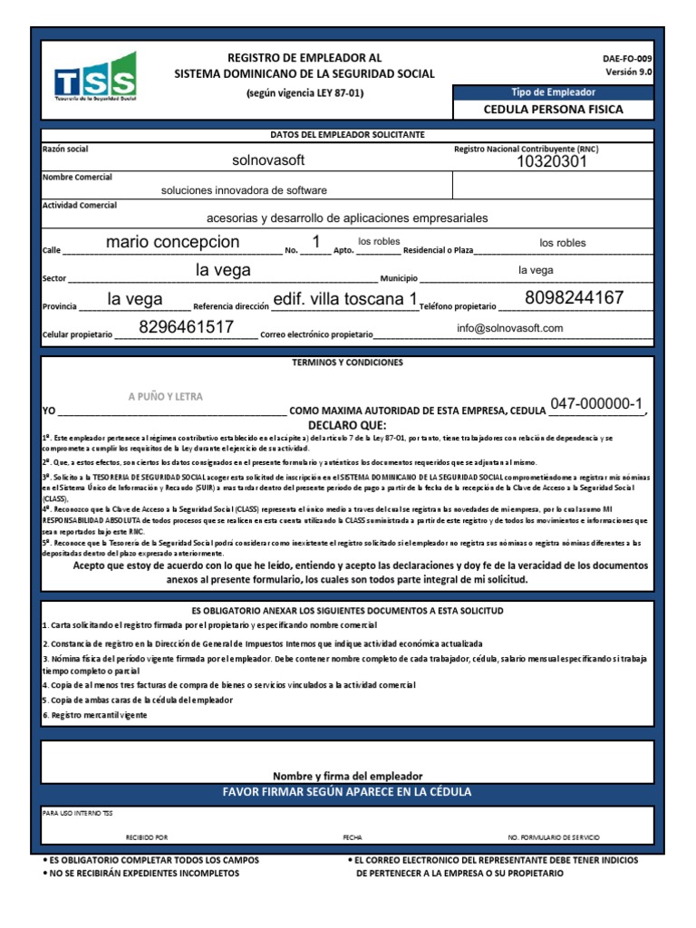 3º. Solicito a la TESORERIA DE SEGURIDAD SOCIAL acoger esta solicitud de inscripción en el SISTEMA DOMINICANO DE LA SEGURIDAD SOCIAL comprometiéndome a registrar mis nóminas