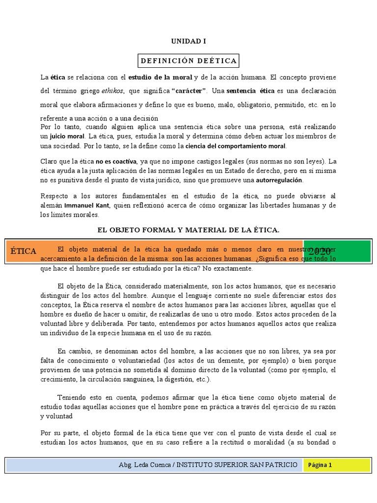 ÉTICA El objeto material de la ética ha quedado más o menos claro en nuestro2020 primer